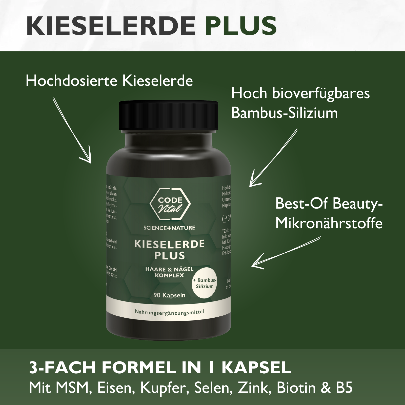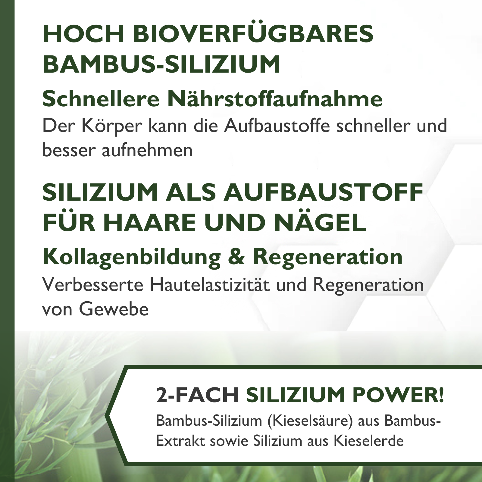 + 2-fach Silizium Power: Kieselsäure (hoch-bioverfügbar aus Bambusextrakt) + Kieselerde (hochdosiert)