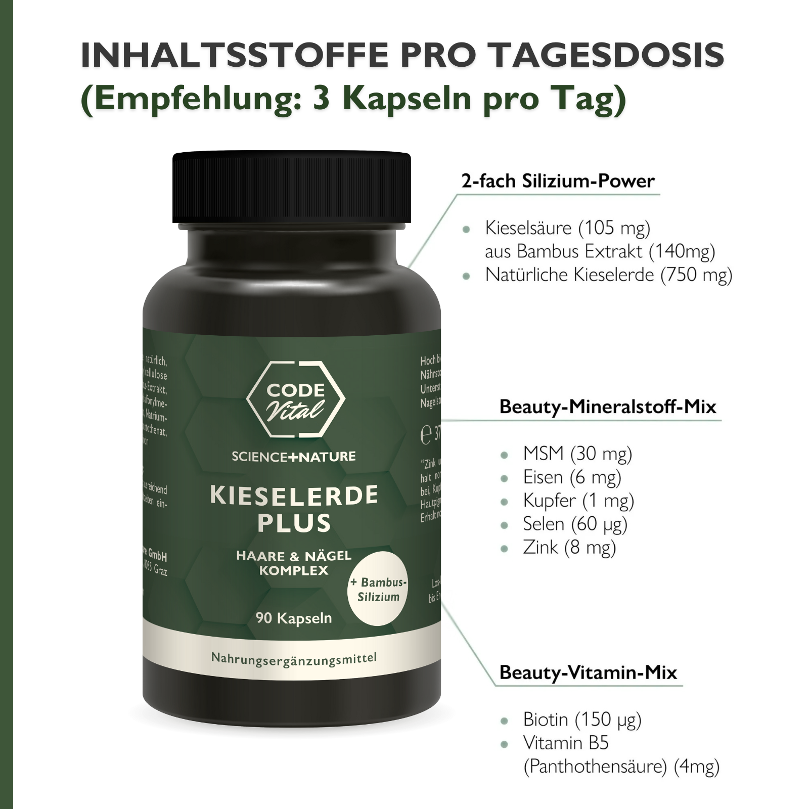 Bambus weist einen Gehalt von 77 % Kieselsäure auf und ist damit einer der besten pflanzlichen Kieselsäure-Lieferanten. Bambussilizium ist rein biologisch und kann daher vom Körper besonders gut aufgenommen werden (hohe Bioverfügbarbeit). - MSM wird auch „Schönheitsmineral“ für Haare und Haut genannt. Es ist eine natürliche, im Körper vorkommende Schwefelquelle, und Schwefel ist für die Produktion von Keratin und Kollagen, den Hauptbestandteilen von Haaren und Nägeln, unerlässlich